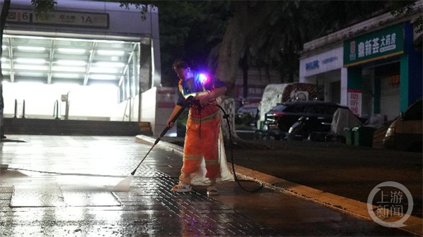 一辆高压冲洗车,两名环卫工人,在黄秀敏与同事的共同配合下,人行道及道路护栏上的油污被一点点洗掉。这里的冲洗工作持续了近一个小时,直到天慢慢亮起,路上开始陆续出现行人。