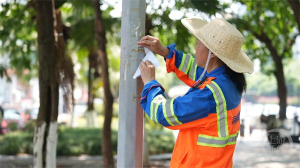 快速吃过早餐后,包括黄秀敏在内的环卫工人们开启了当天的巡回保洁工作:清扫地上散乱的垃圾,撕下路边张贴的小广告。9点后烈日的考验正式开始,阳光的照射让众人身上的环卫工作服迅速浸湿。