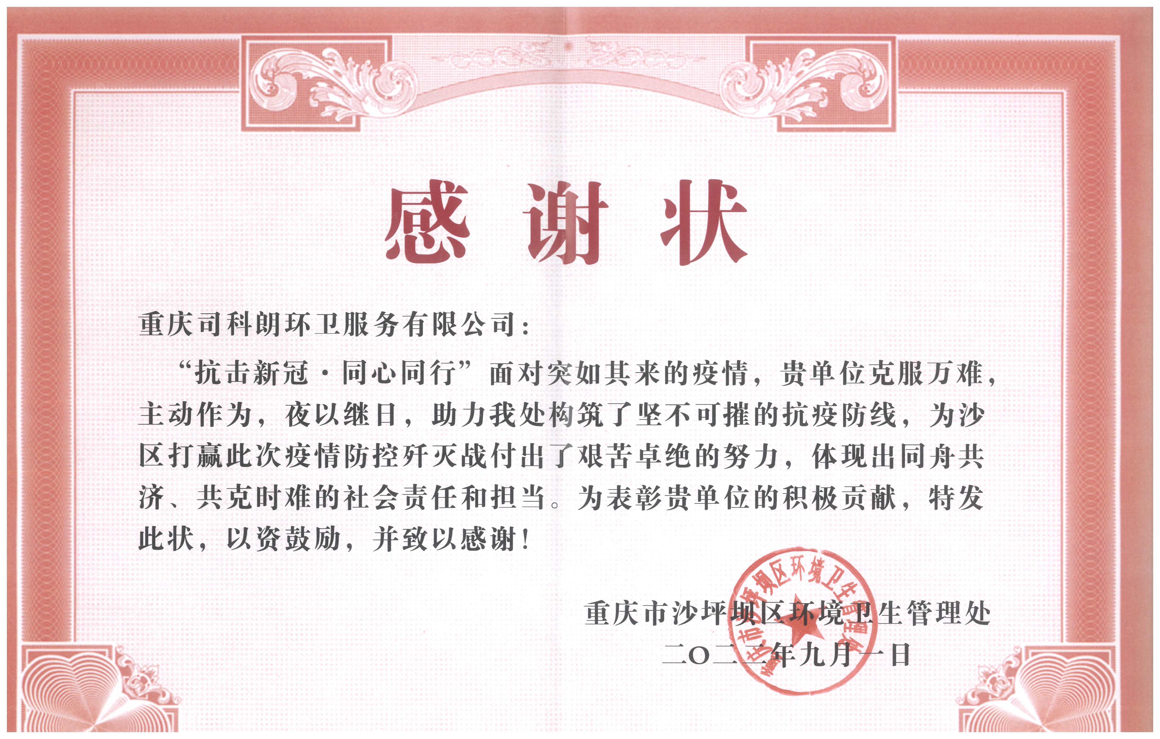 司科朗总公司抗击新冠同心同行感谢状